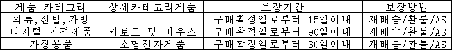 2. 의류, 신발,가정용품 및 기타 유사한 품목은 특성 및 용도로 인해 이 보증 기간에 포함되지 않습니다.